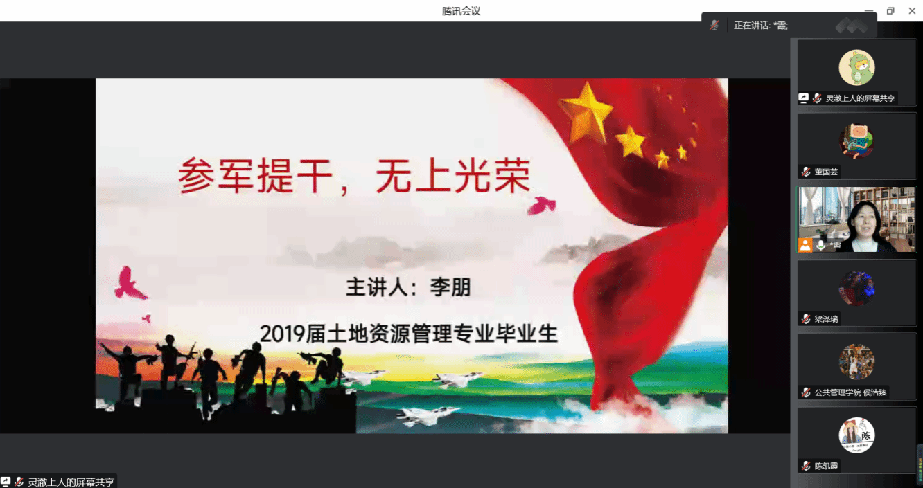 为扎实推进2023届毕业生就业工作,引导毕业生了解当下就业形势,拓宽就业视角,树立正确的就业观和择业观。437bwin必赢国际官网于2022年12月5日晚在腾讯会议举办了“朋辈引领话就业”就业分享会,会议邀请了2019届土地资源管理专业毕业生、现某部队军官李朋和2022届研究生毕业生陈力做主题讲座,李霞老师主持。